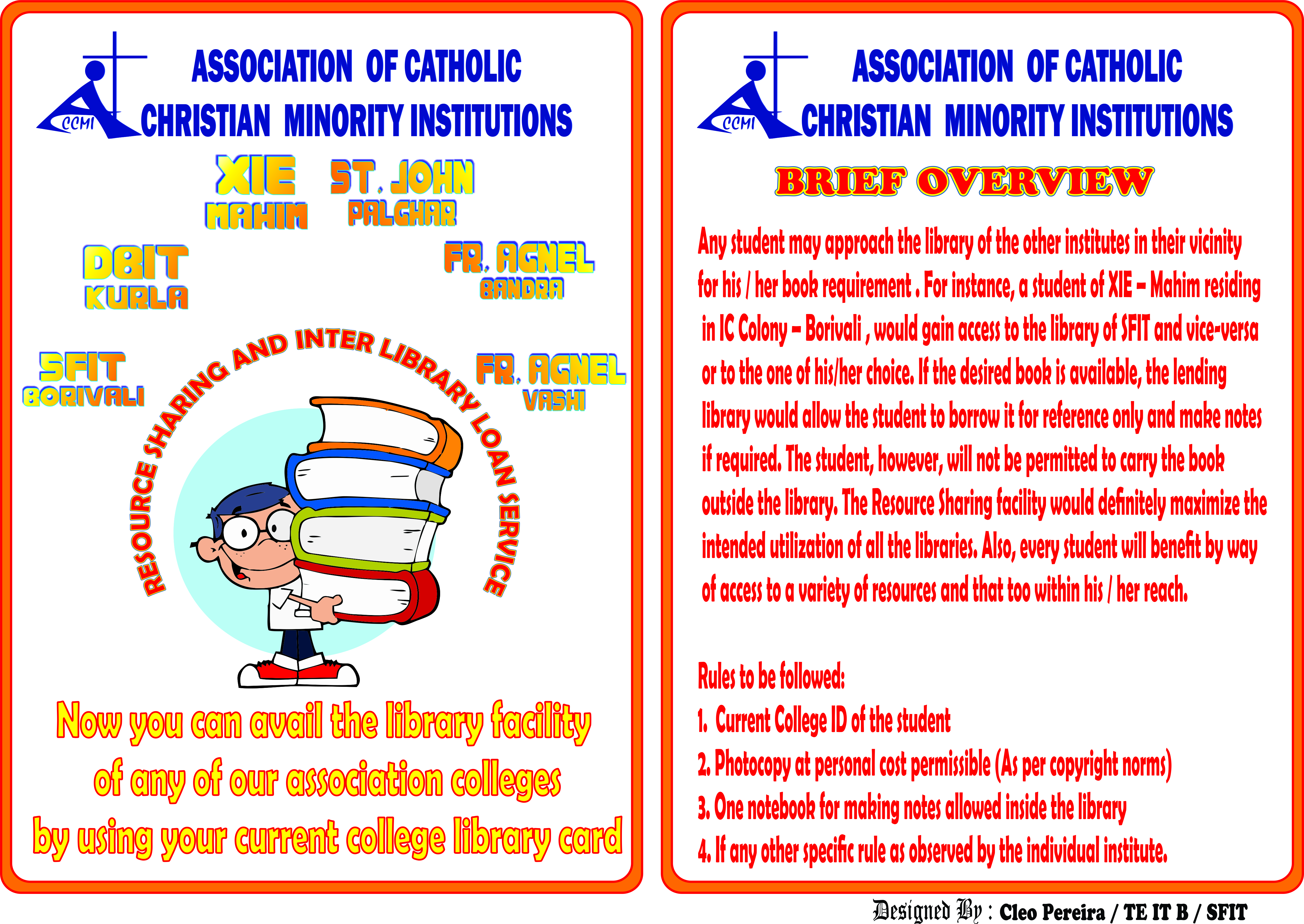 Students can avail of the Library facility of any of our Minority Institutions. Libraries such as XIE Mahim, St.John Palghar, DBIT Kurla, SFIT Borivali, Fr.Agnel Vashi by using your Identity card.